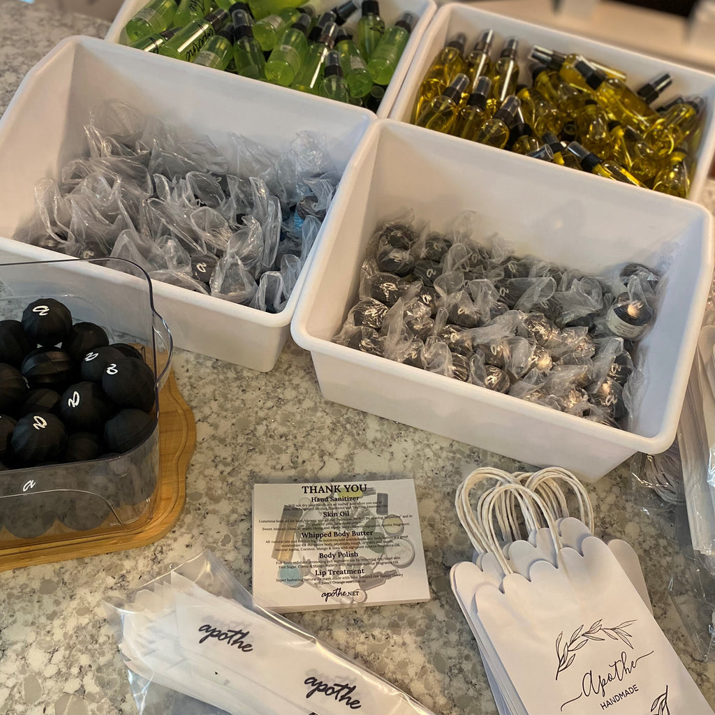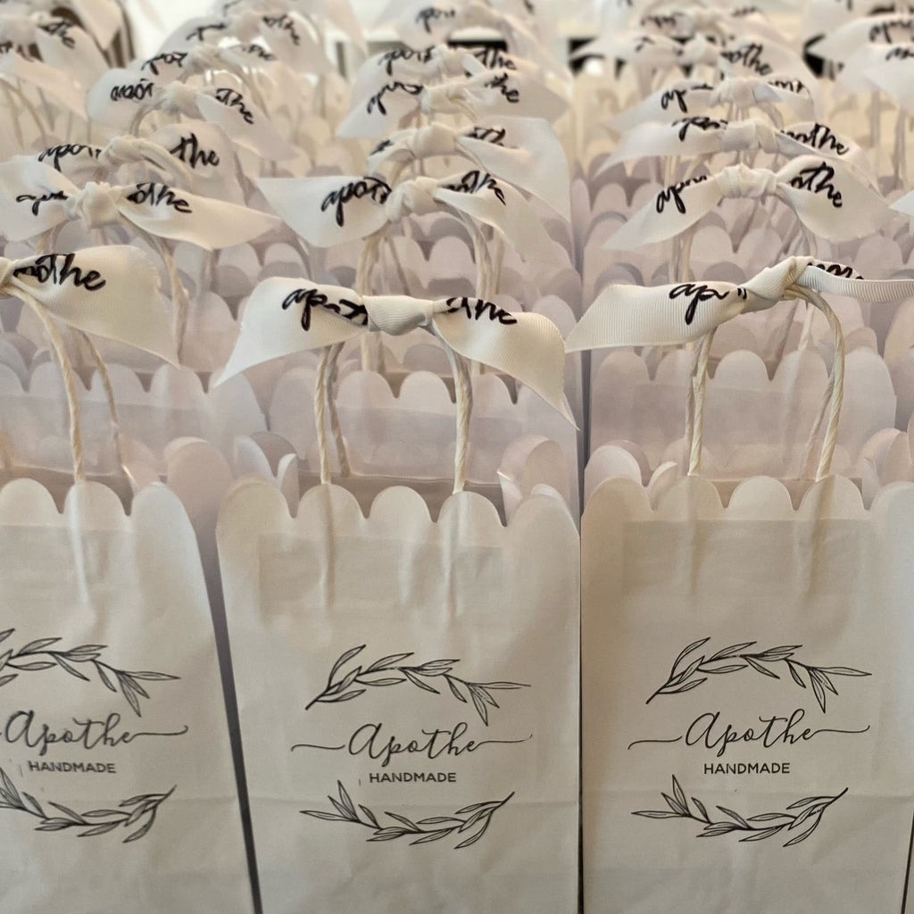 Our sample bag is shipped to you in separate pieces and includes: Apothe products, bag, black crinkle paper, a beautifully printed insert card and a ribbon to tie it all together!