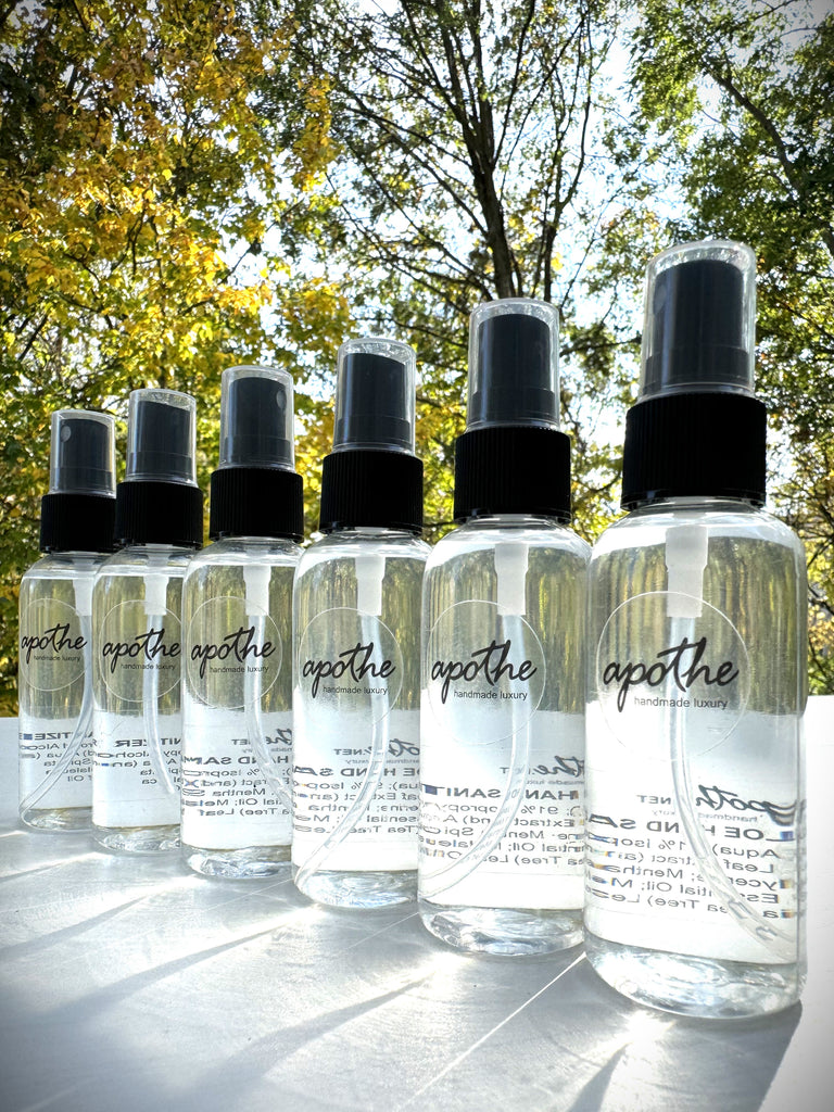 Apothe moisturizing hand sanitizer will never dry out your skin no matter how many times you use it. Our blend of aloe, premium spearmint and tea tree essential oils not only protects and soothes your skin, it also smells great- not like pure alcohol! Made with 91% isopropyl, our sanitizer goes above and beyond to allow you to keep yourself safe and protect your skin at the same time! A must have and a super popular product. Conveniently packaged in 2.2oz spray bottles, this product provides easy access wherever you are and lasts for a long time. Never leave it behind!