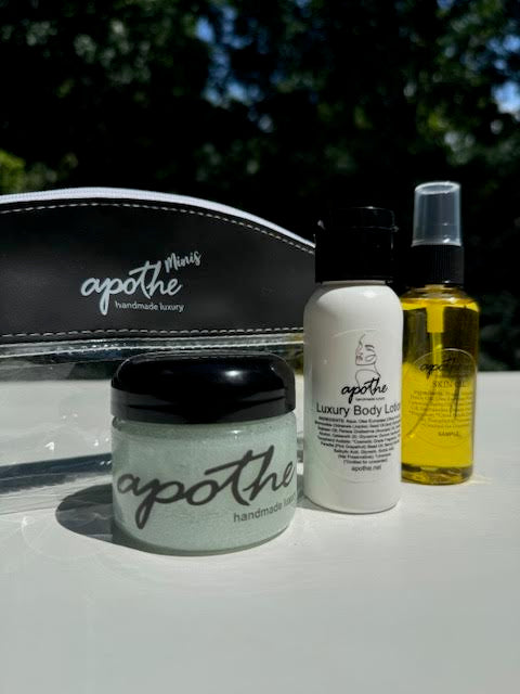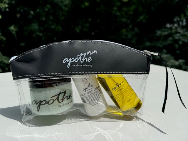 Apothe Mini's are FINALLY here! So many of you have requested travel-sized Apothe products and we have delivered. In this absolutely adorable kit you will get 3oz Skin Polish, 2.2oz Skin Oil and 2oz Luxury Body Lotion! Just toss your cute mini bag into your carry on and you're good to go!