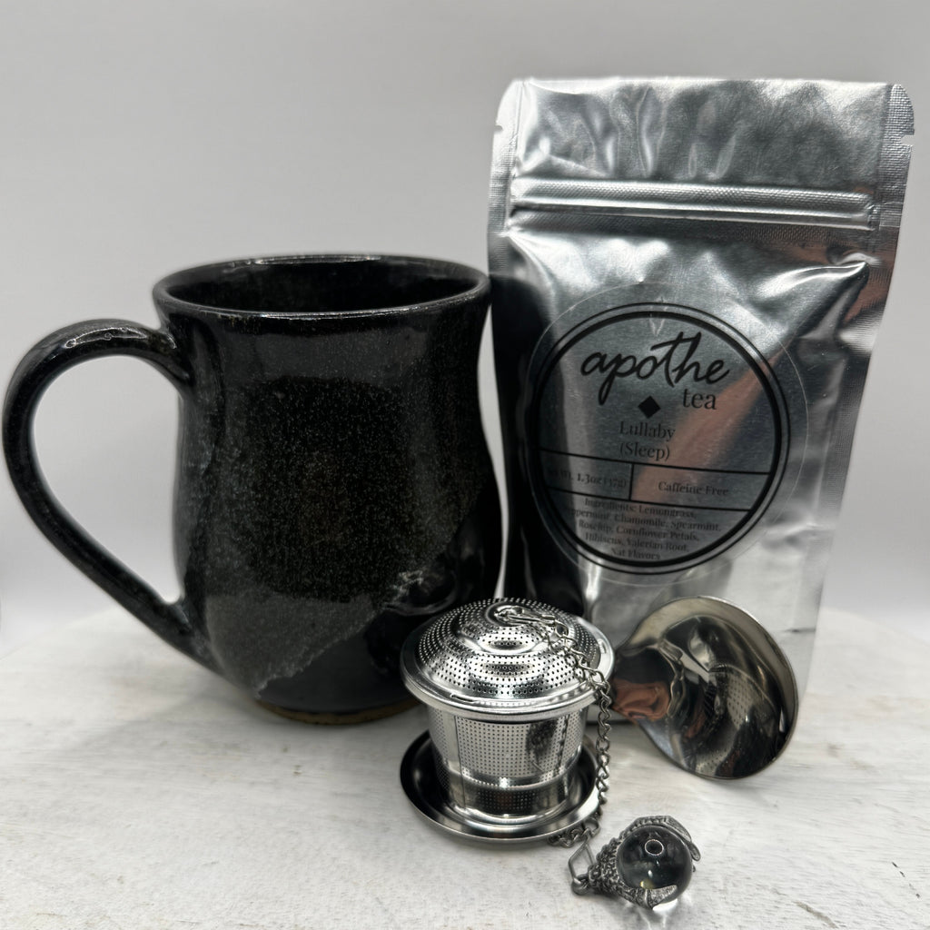 Your choice of a full-sized bag of tea...and includes one of our tea infusers with a special charm that hangs over the side of your cup! You will also receive an elegant stainless steel tea scoop and our one-of-a-kind handmade tea cups! The cups are custom-made by a local potter in Lexington, Ky.